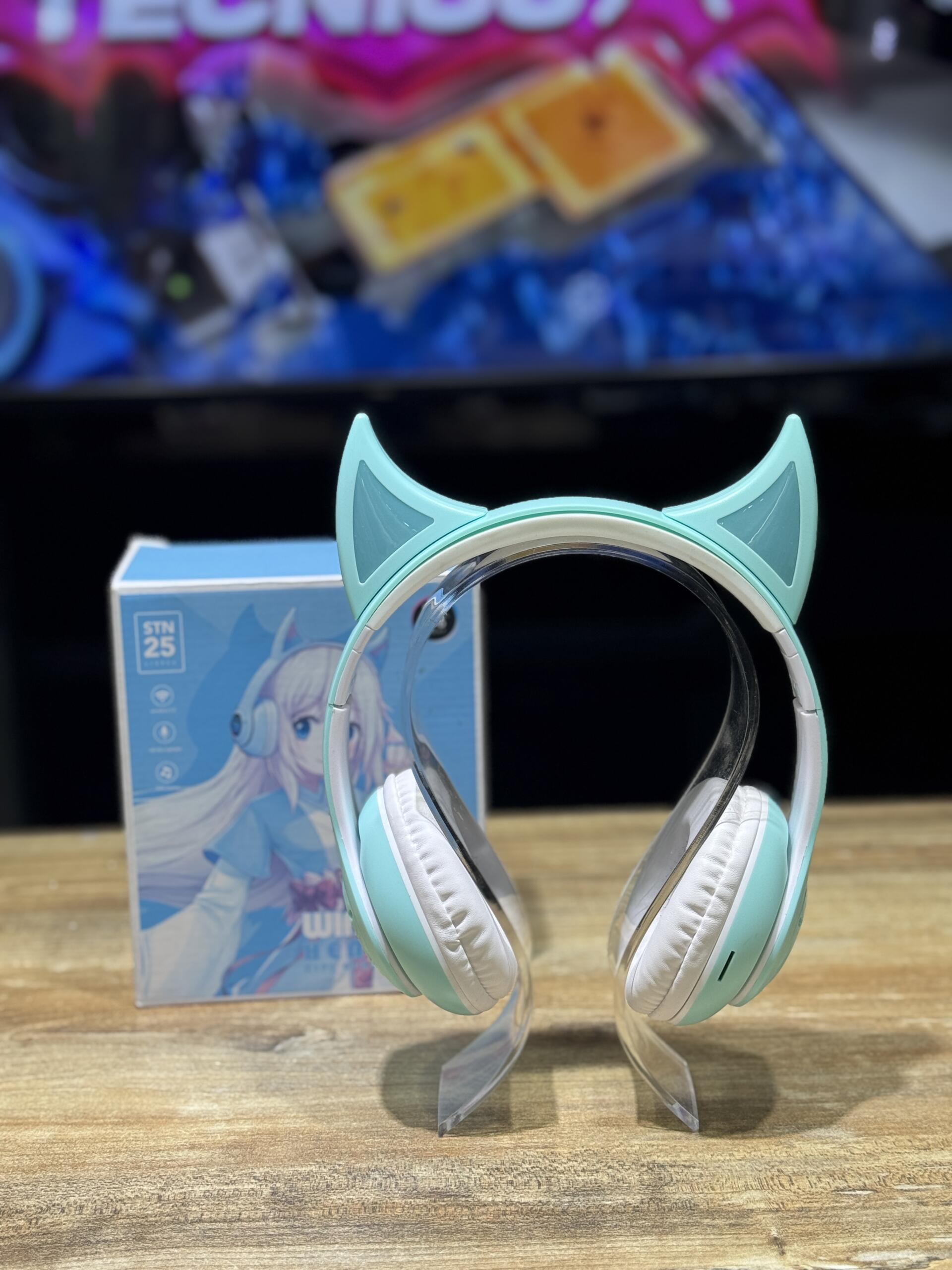Auriculares Bluetooth infantiles/juveniles con diseño adorable de orejas de gato en color turquesa y blanco. Ideales para niños, niñas o fans del estilo anime/kawaii. Incluyen luces LED, micrófono, almohadillas cómodas y son plegables. Compatibles con celulares, tablets y computadoras vía Bluetooth 5.0 (también tienen entrada 3.5 mm y ranura TF).