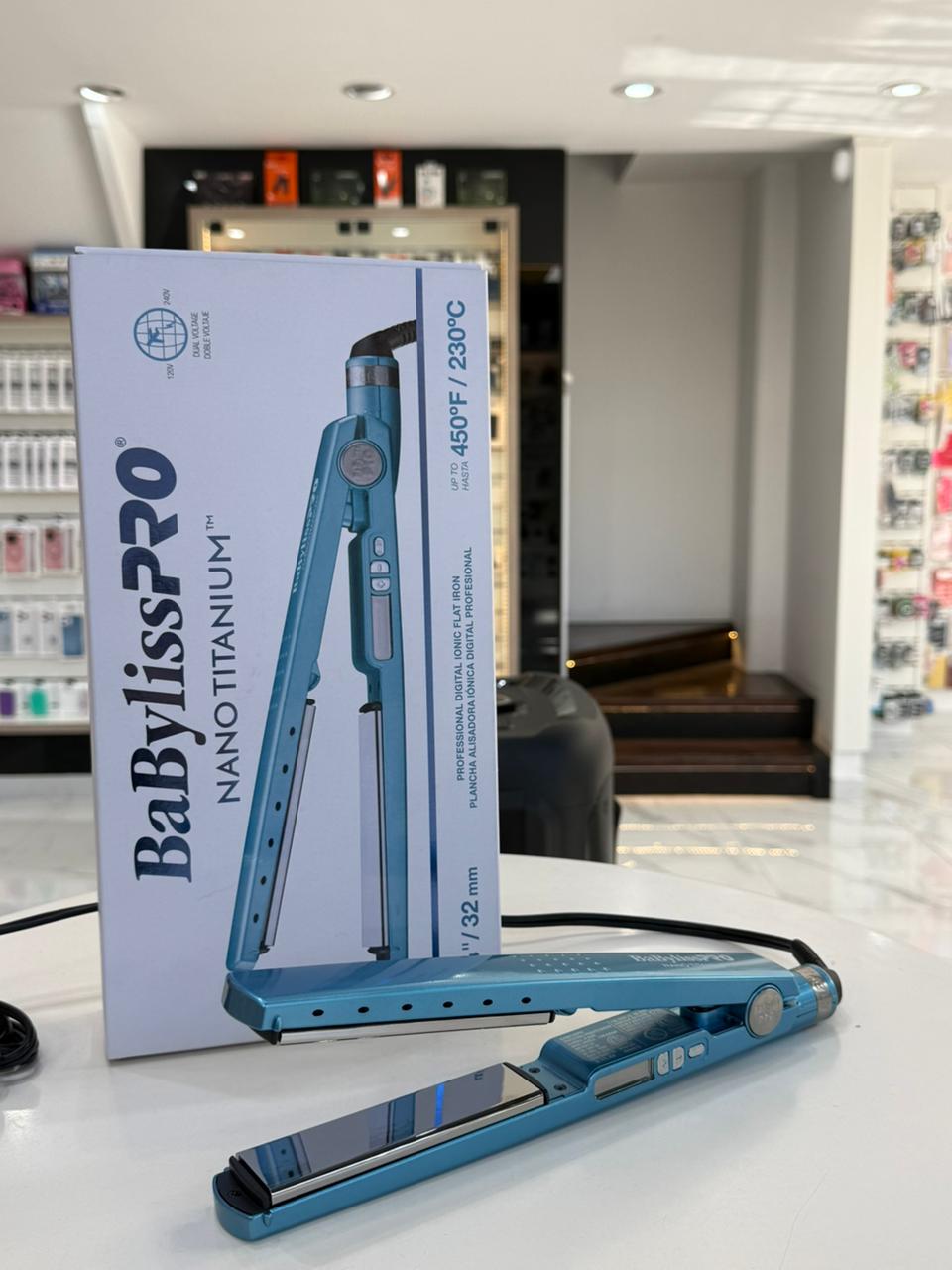 Plancha profesional BaBylissPRO Nano Titanium de 32 mm, con placas de titanio que distribuyen el calor de forma uniforme para un alisado rápido y sin frizz. Alcanza hasta 230 °C (450 °F), ideal para todo tipo de cabello, con diseño ergonómico y control digital para mayor precisión