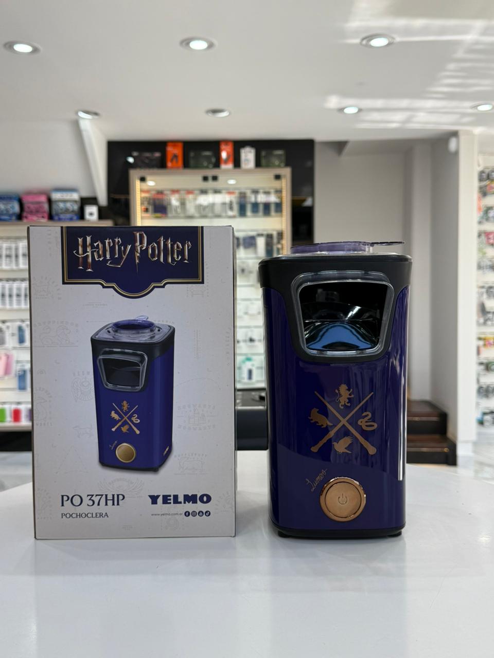 pochoclera Yelmo de la línea Harry Potter, con diseño temático inspirado en la saga. Permite preparar pochoclos de manera rápida y saludable gracias a su sistema de cocción por aire caliente, sin necesidad de aceite. Tiene una capacidad de aproximadamente 60 gramos de maíz por tanda, ideal para disfrutar en casa. Es compacta, fácil de usar y perfecta para vivir una experiencia mágica de cine en familia