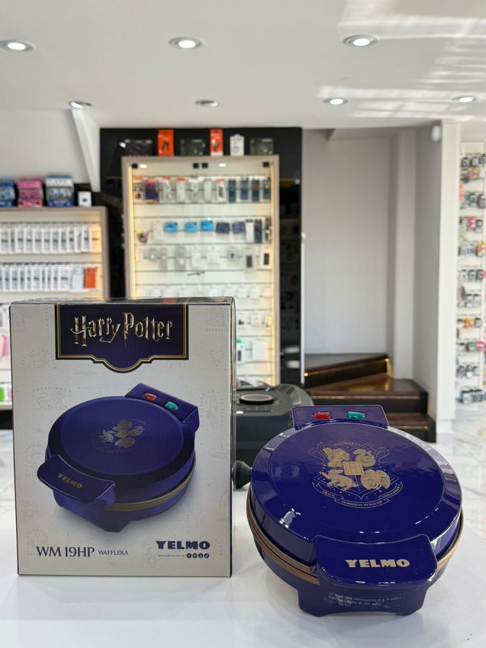 Waflera Yelmo de la línea Harry Potter, con diseño temático inspirado en la saga y acabado en azul medianoche con detalles dorados. Es una edición limitada.Tiene una potencia de 850 W, lo que permite cocinar waffles de forma rápida y pareja, logrando una textura dorada por fuera y suave por dentro. Cuenta con placas antiadherentes, termostato automático, luces indicadoras de encendido y listo, y cierre de seguridad en el mango para mayor comodidad
